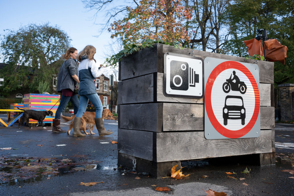 行人经过由南华克市议会设置的花园障碍物,形成了一个低交通量社区的道路封闭特色。