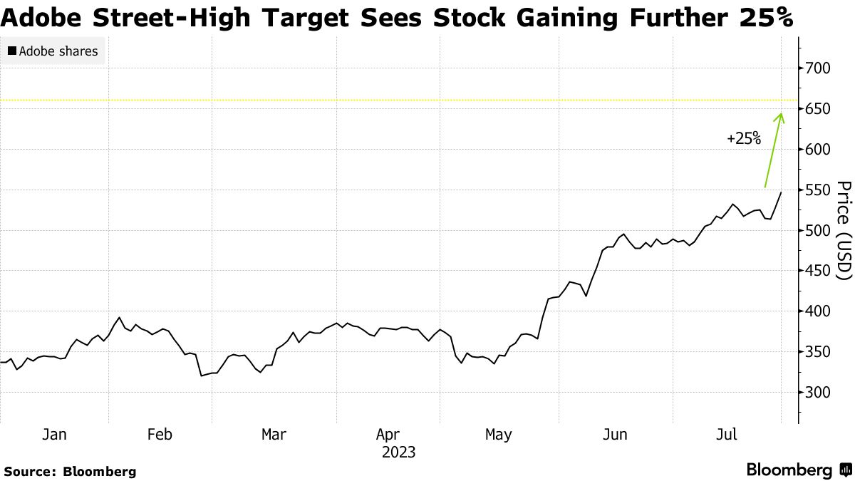 Adobe今年股价上涨超过60%,受到人工智能的乐观情绪推动战略,Weiss设定的新的华尔街最高目标为660美元,预计股价将接近2021年的最高纪录688.37美元。