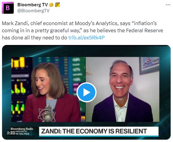 今天在彭博电视台的权力平衡节目中,主持人安玛丽·霍登和乔·马修采访了蒂·科布,前特朗普白宫特别顾问。早些时候在彭博电视台,穆迪分析公司首席经济学家马克·赞迪预测美国经济将实现软着陆。