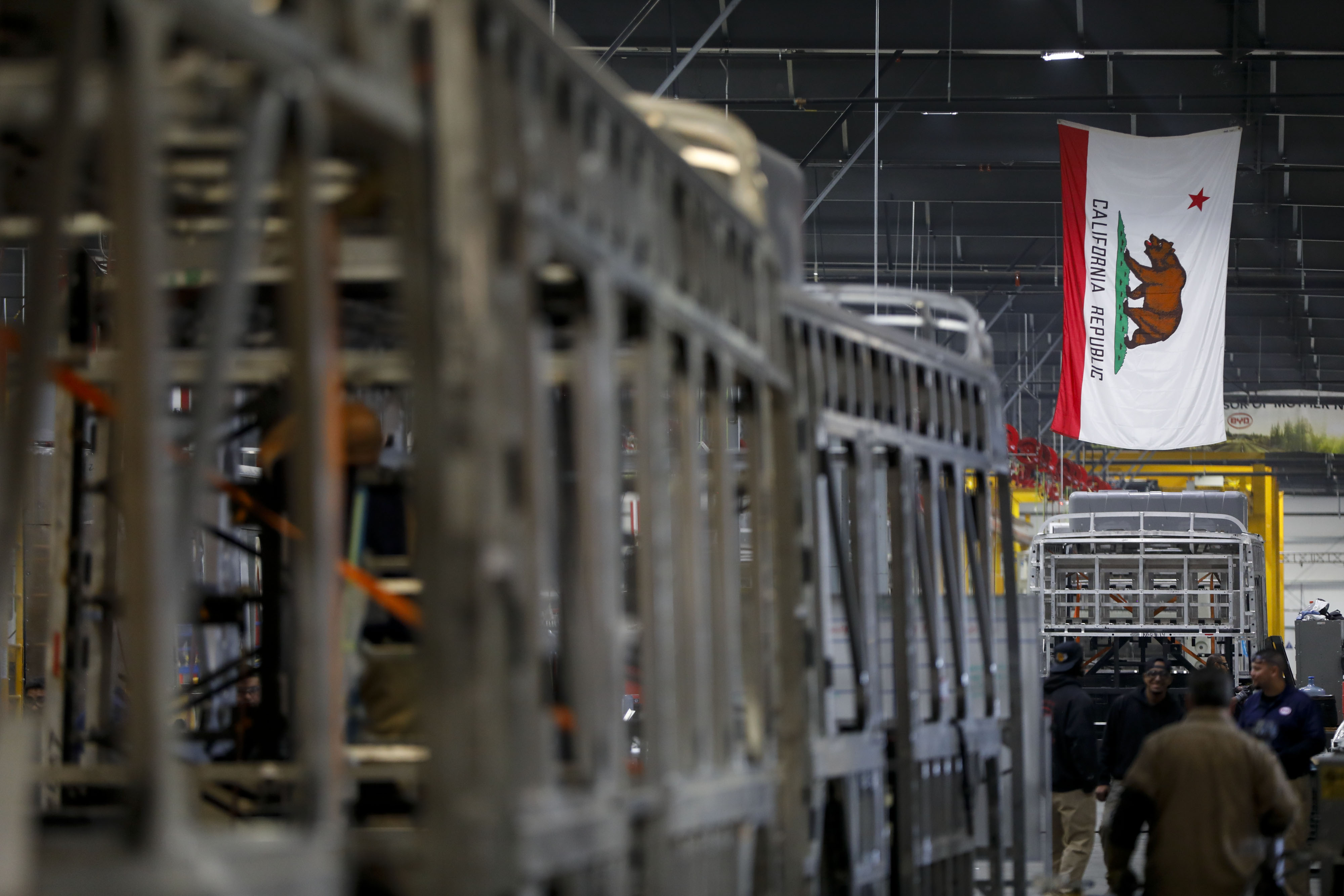 加利福尼亚州兰开斯特市的一家公共汽车工厂内的加利福尼亚州州旗。