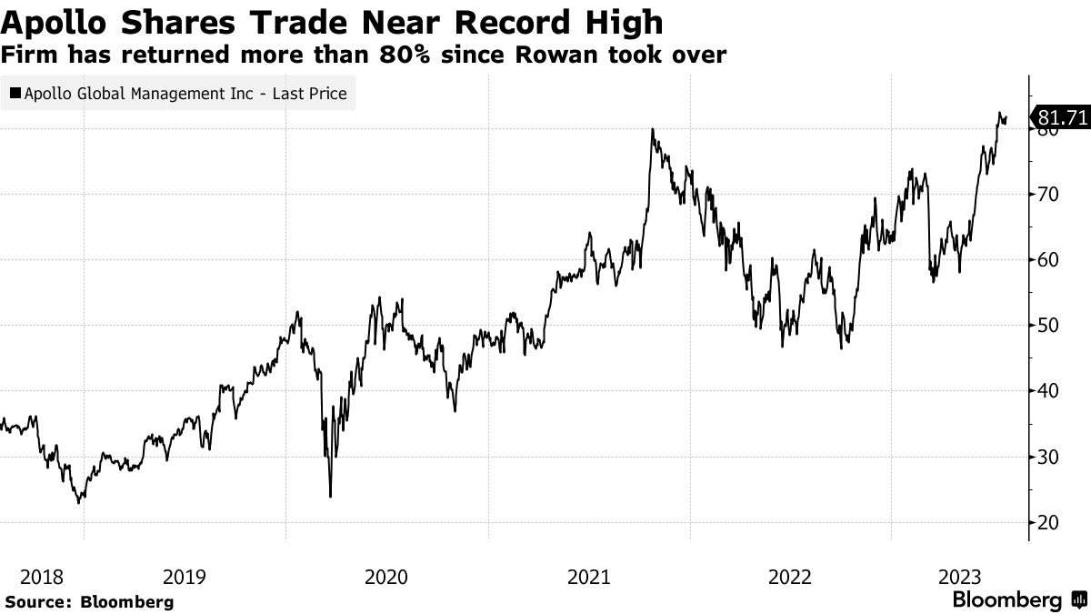 股市似乎同意。该公司的股票交易价格达到了创纪录的81.46美元,并且自2021年3月Rowan担任CEO以来,股价已经上涨约84%,包括再投资的股息。相比之下,标普500指数的回报率近22%。阿波罗的投资者将在8月3日报告第二季度收益时再次看到该公司的表现。根据彭博社调查的13位分析师的平均估计,该公司预计每股盈利为1.65美元。