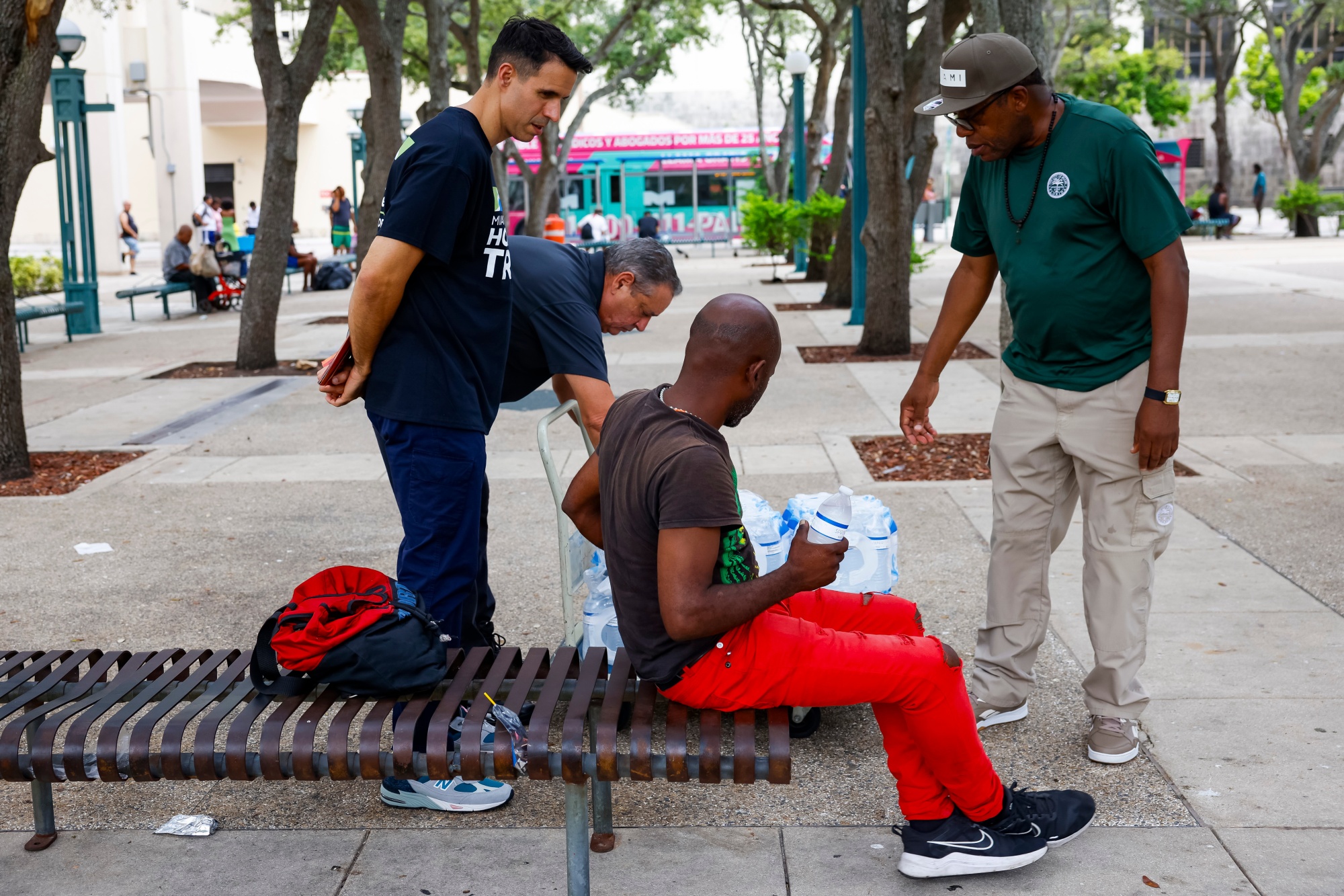 迈阿密戴德县无家可归信托代表在城市最近的热浪期间分发瓶装水和住所信息。摄影师:Eva Marie Uzcategui/Bloomberg气候变化“尚未被纳入目前最大评级公司使用的方法论中”,曾负责标普全球主权债务评级的Moritz Kraemer说,他现在是德国LBBW银行的研究主管。