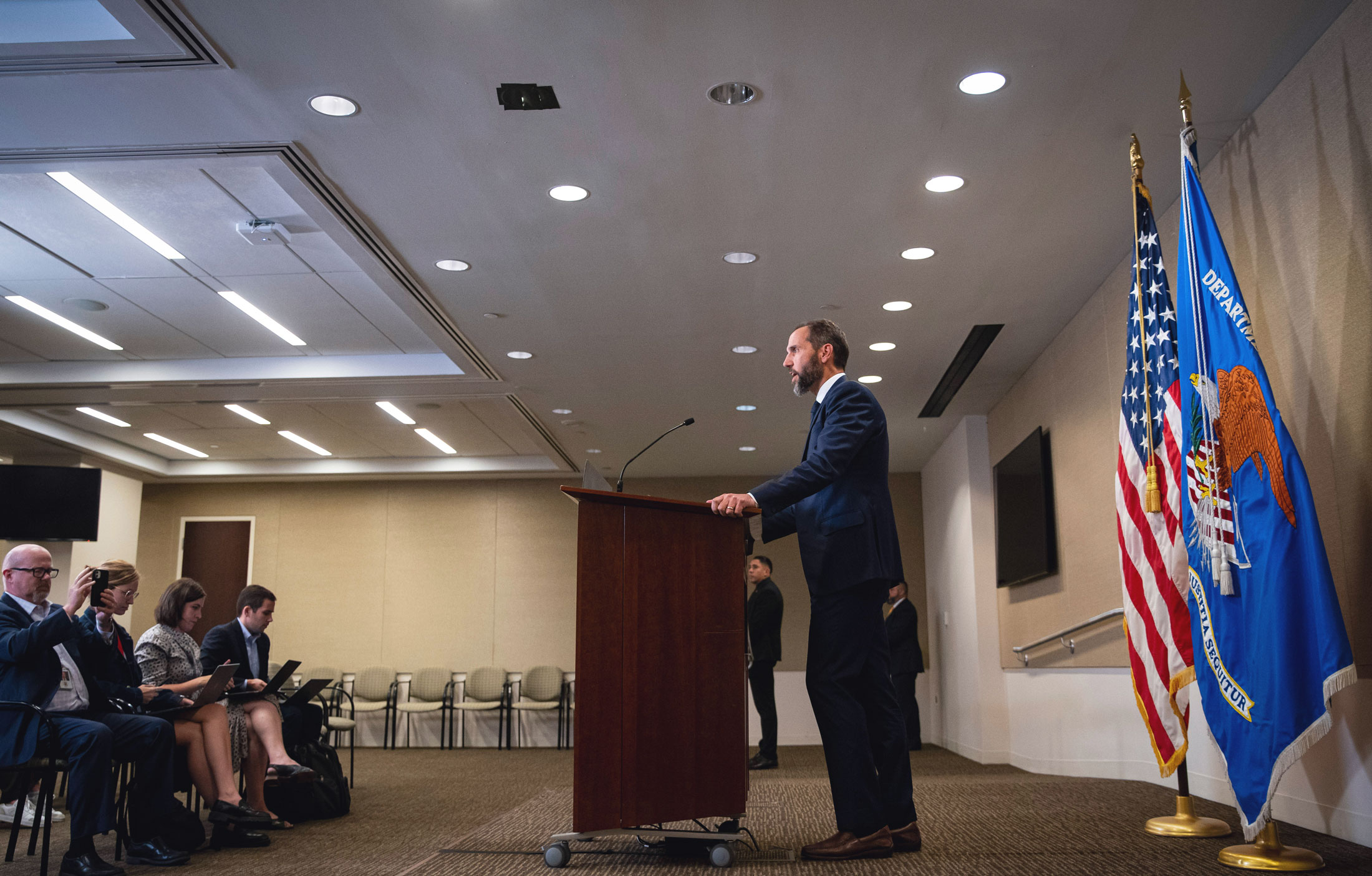 杰克·史密斯在8月1日华盛顿特朗普被起诉后向记者发表讲话。摄影师:Al Drago/Bloomberg阅读更多: 特朗普2020年选举起诉:案件时间线