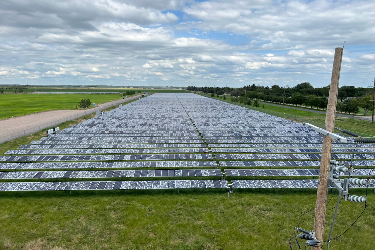 内布拉斯加州斯科茨布拉夫附近的太阳能场所遭受冰雹损坏,发生在2023年6月。摄影师:内布拉斯加州公共电力公司内布拉斯加州西部的斯科茨布拉夫太阳能场所建造得足以抵御大多数冰雹。但是2023年6月下旬降落的冰雹比棒球还要大。