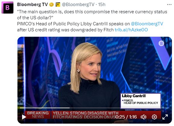 今天在彭博电视台的*权力平衡**,*主持人Annmarie Hordern和Joe Mathieu采访了前水门事件检察官Nick Akerman,谈论最新的特朗普起诉。在昨天的节目中,PIMCO的公共政策负责人Libby Cantrill称Fitch的降级时机“有点可疑”。