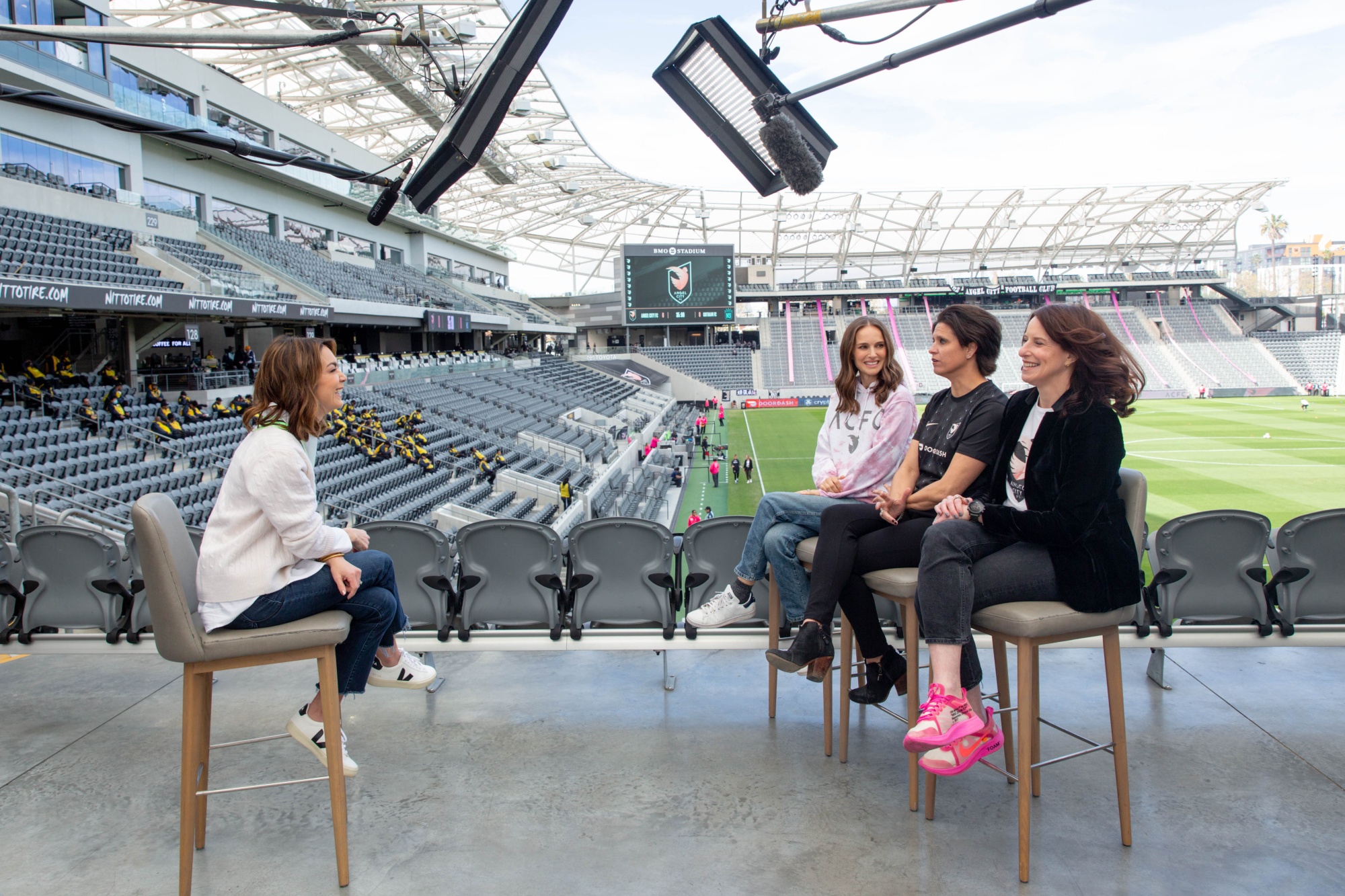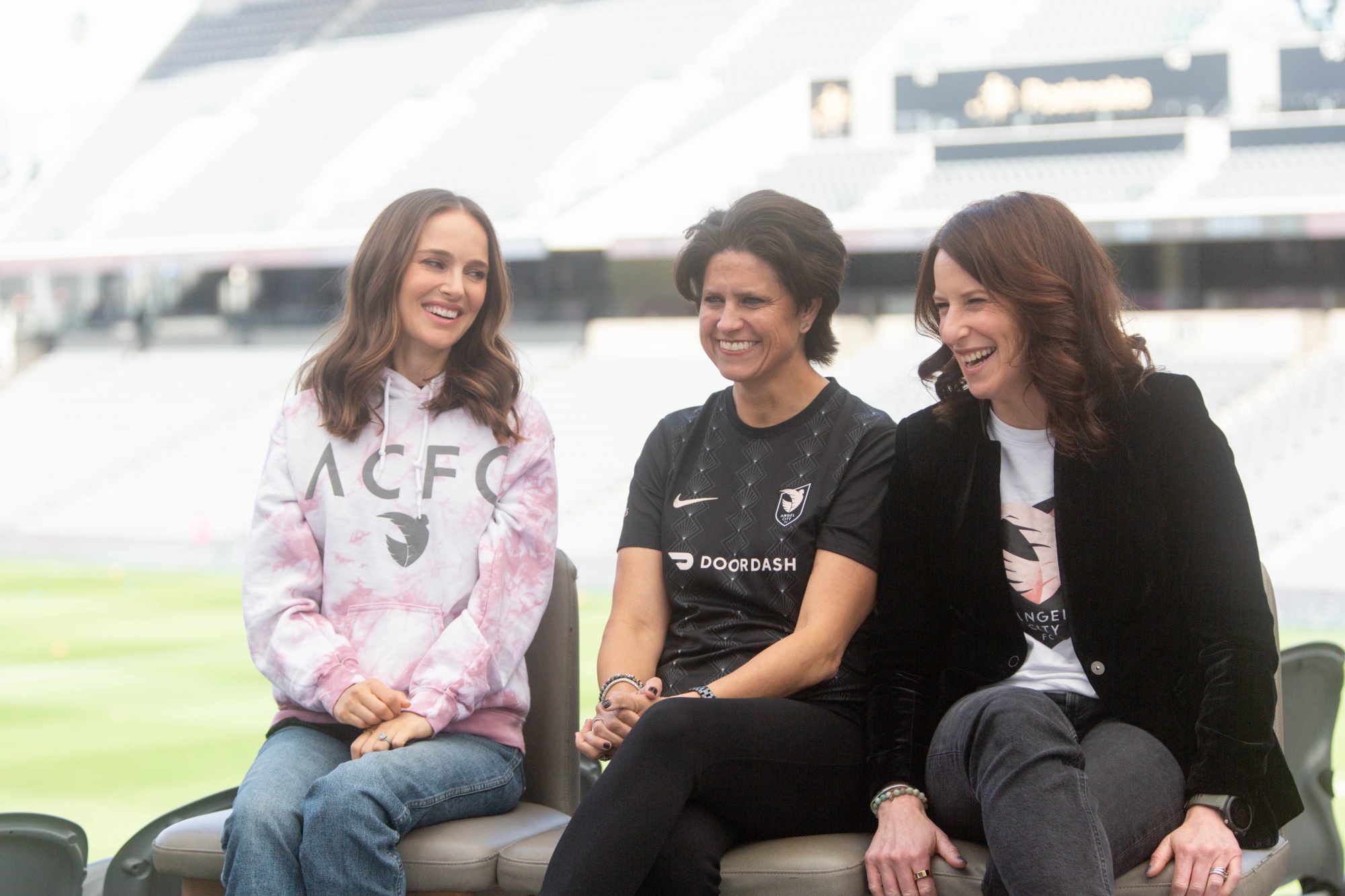 娜塔莉·波特曼、朱莉·乌尔曼和卡拉·诺特曼在开幕比赛前。摄影师:Allison Zaucha/Bloomberg尽管这支球队本赛季没有取得胜绩,但所有者们对俱乐部和这项运动的未来持乐观态度。天使城足球俱乐部在洛杉矶的比赛门票已售罄,球场气氛热烈。