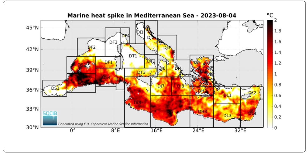 将地中海海域前所未有的海温加入到今年夏季打破的与高温有关的记录清单中。