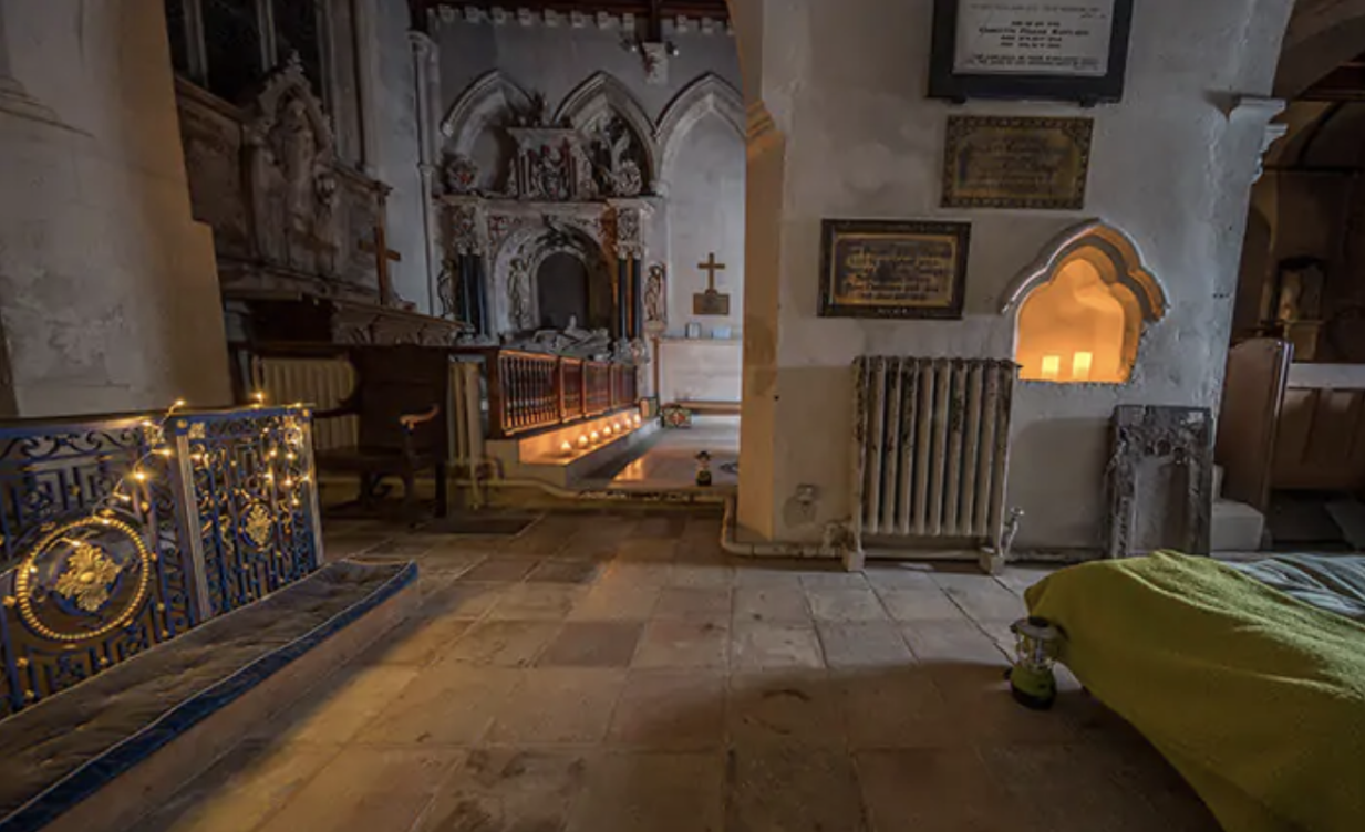 对于过夜客,床铺设置在一个侧礼拜堂里。照片由教堂保护信托提供虽然比外面要冷得多,但教堂仍然相当舒适。戴尔在侧礼拜堂里摆放了一对露营床,配有温暖的睡袋和枕头。在旧唱诗班区,我们找到了折叠椅和羊毛毯,还有茶、咖啡和水壶。还提供了酒杯和开瓶器 — — 住宿网站明确表示在教堂内饮酒是可以的,但在外面的院子里是不可以的,因为那样可能会打扰到前来参观坟墓的人。