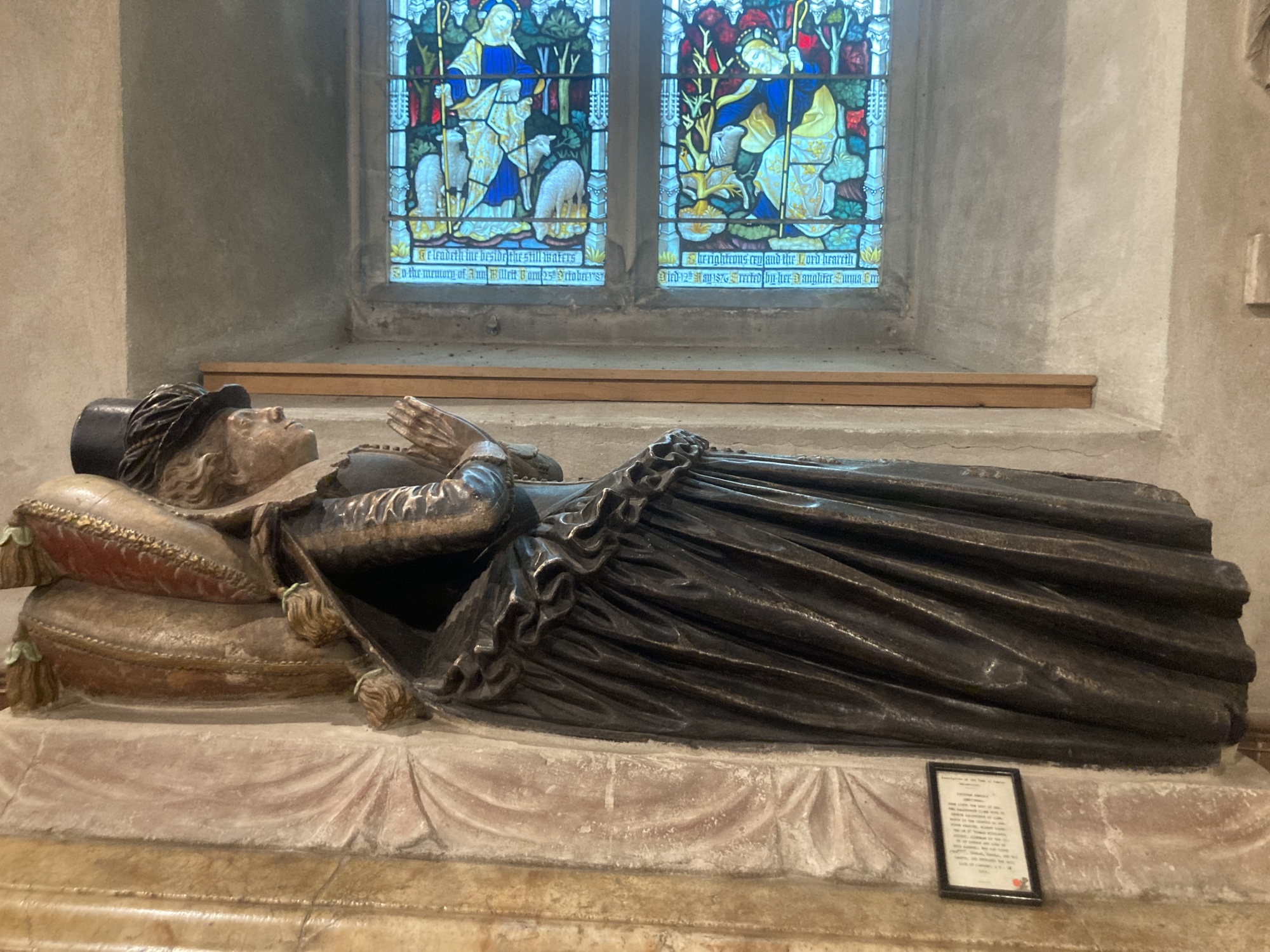 当我们开始探索这个空间时(遗憾的是,砖砌钟楼是禁止进入的),我们也开始注意教堂的永久居民。在一个通道里,有一个纪念 赫斯特·萨尔斯伯里,她在1614年冬天与一只雄鹿发生致命冲突后被埋葬在那里;她的石像展示了她靠在两个枕头上戴着一顶时髦的帽子和笨重的法丁格礼服。就在我们的露营床铺旁边,有一个更古老的骑士雕像,是 罗杰·德·兰开斯特,他于1291年去世,现在永远将脚踏在一只不幸的石灰石狗上。