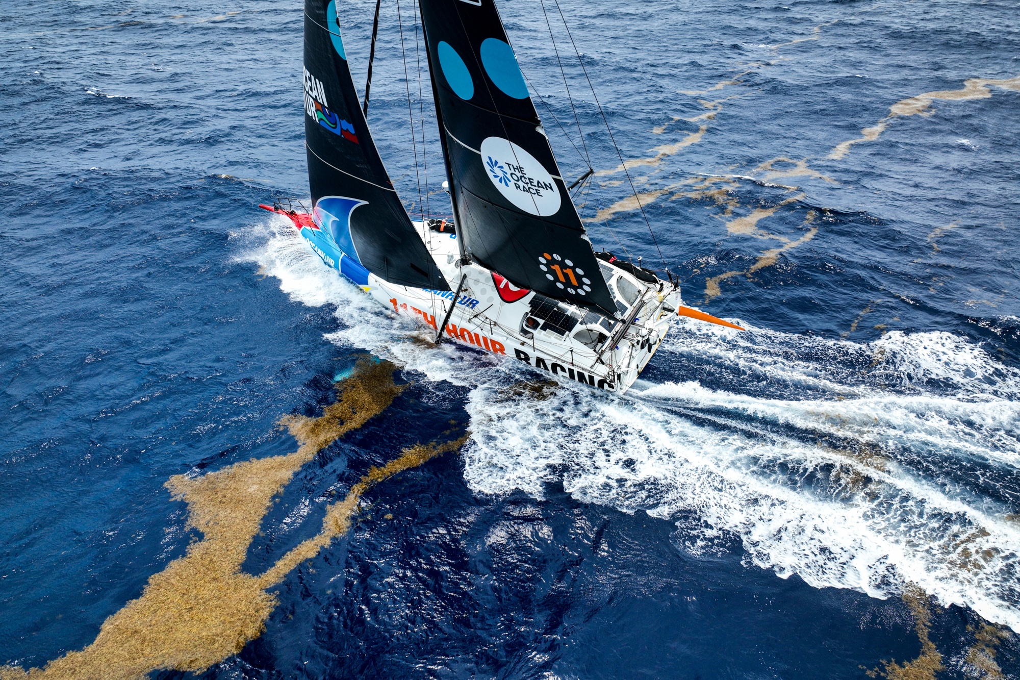 第11小时赛车队在环球帆船赛中穿越一排海藻,时间是5月3日。