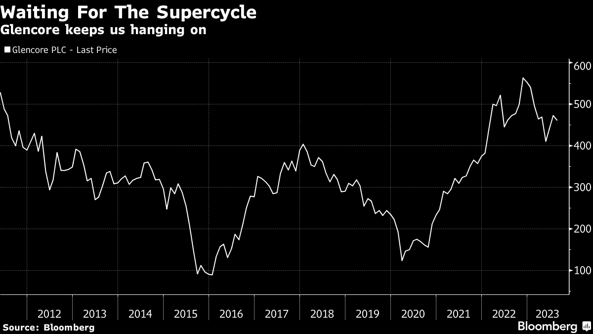 只是提醒一下:我选择了嘉能可,因为它涉足你能想到的所有与资源相关的领域。更重要的是,这个图表似乎很好地反映了大宗商品的命运。你可以看到a)它在2011年上一个大宗商品泡沫的顶峰上市;和b)它在随后2016年大宗商品熊市的低谷触底。