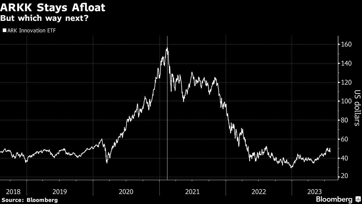 ARKK 在 2022 年底触底,并在通货膨胀可能已经达到峰值、利率必定很快会跟随的希望中逐步上升。