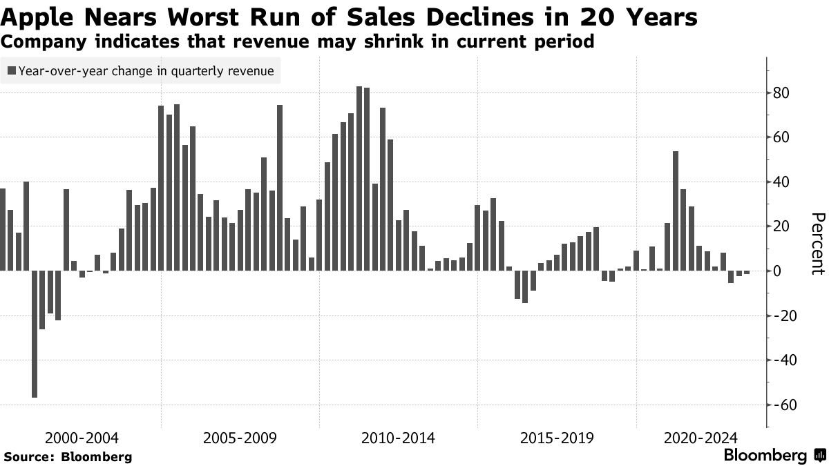 在财政第三季度销售额下降了1.4%之后,首席财务官卢卡·马埃斯特里在电话会议上表示,苹果本季度的表现将类似。如果再次下降,这将标志着20年来最长的下滑期——对于全球市值最高的公司来说,这是一个惊人的放缓。