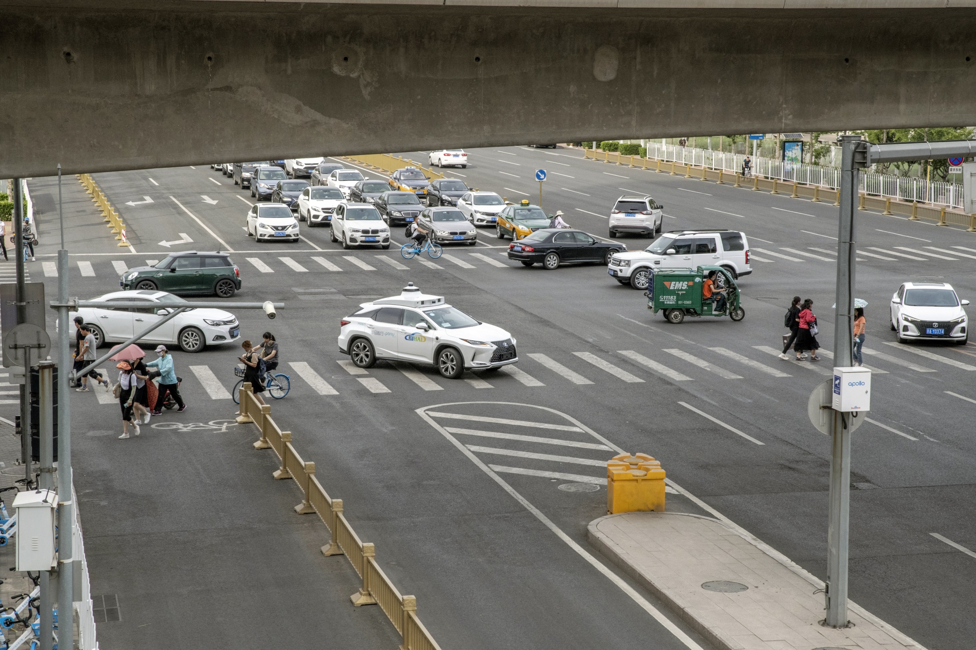 一辆Pony.ai公司的自动驾驶车辆,中心,穿过北京的一个十字路口,2021年。