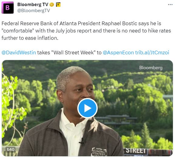 今天在彭博电视台的权力平衡节目中,主持人乔·马修和凯莉·莱因兹(Kailey Leinz)将采访代理劳工部长朱莉·苏(Julie Su)和前联邦检察官布莱恩·雅各布斯(Brian Jacobs)。此前,亚特兰大联邦储备银行行长拉斐尔·博斯蒂克(Raphael Bostic)表示,就业报告显示不需要进一步加息。