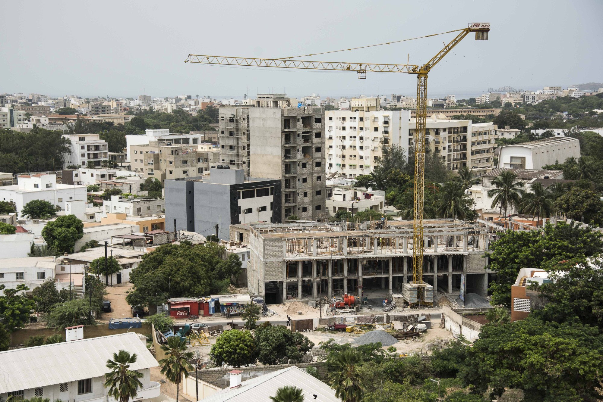 一座起重机矗立在塞内加尔达喀尔E点区正在建设中的建筑物上,时间是2017年7月29日。