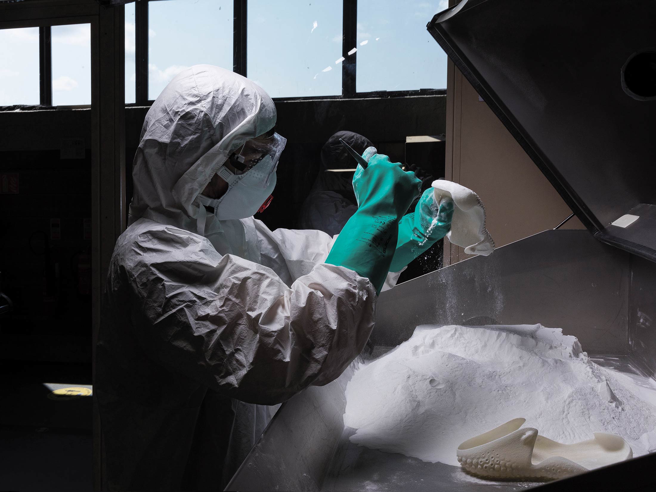 一名工人在爱尔兰Wazp工厂清洁Vivobarefoot鞋底。摄影师:Matthew Thompson为彭博市场拍摄全球贸易中正在发生一场32万亿美元的转型。