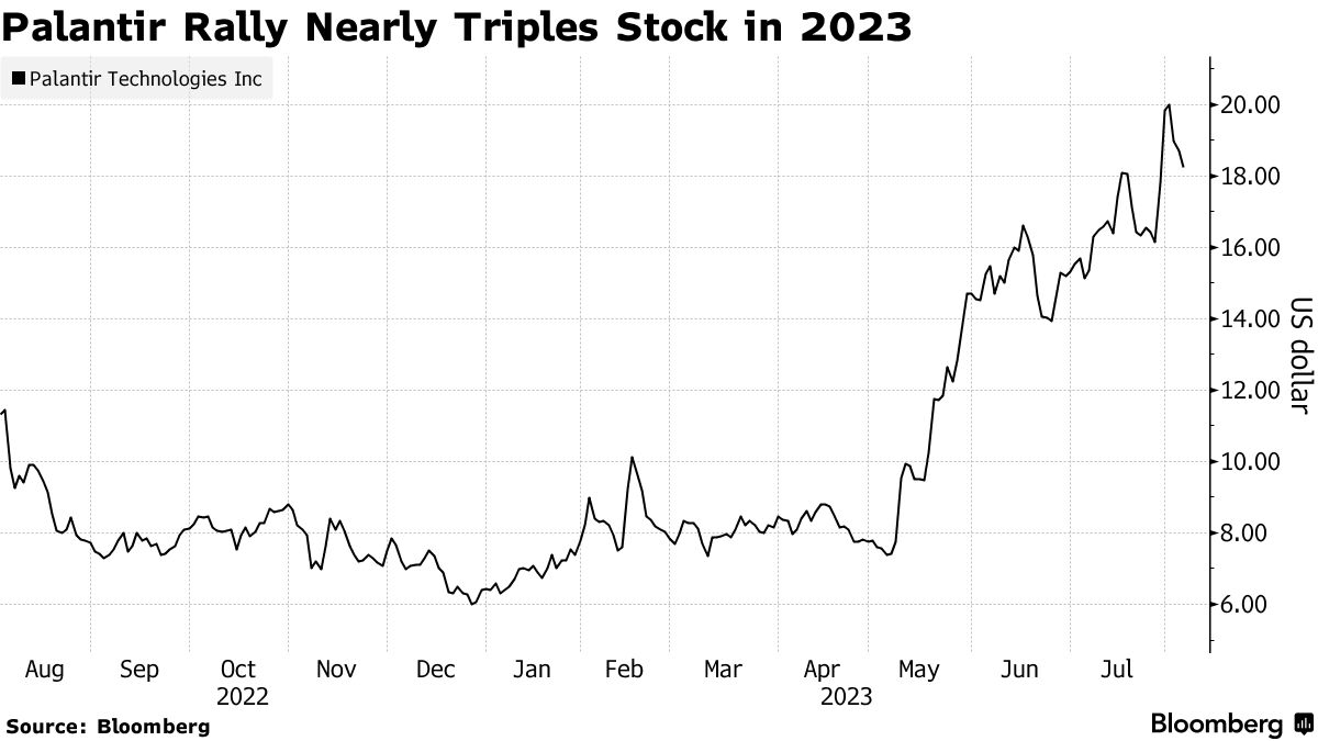 “虽然我们知道Palantir涉足人工智能,但它的许多技术仍未经证明,” Roundhill Financial Inc.的David Mazza在接受采访时说道。该公司赞助了Roundhill Generative AI & Technology ETF。“这类名称,也就是与人工智能有关的任何事物,将不得不开始展示更大的进展来证明其估值。”