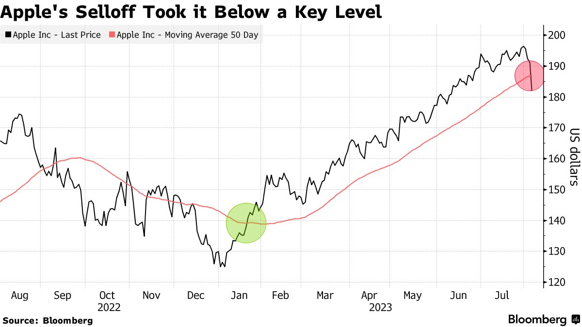苹果周五下跌了4.8%,因为令人失望的业绩导致这家iPhone制造商自去年9月以来的最大单日百分比下跌。这一下跌使该公司的市值明显低于历史上的3万亿美元水平,股价也首次自1月以来收于50日移动平均线以下,这是短期动量趋势疲弱的迹象。