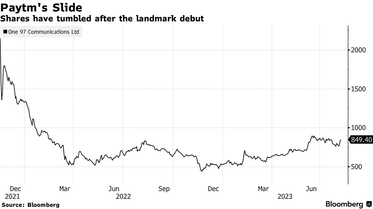 Sharma于2021年将这家数字支付先驱公司上市,但股价暴跌,成为一次重大首次公开发行中最糟糕的表现之一。周五收盘价为796.6卢比(9.63美元),而发行价为2150卢比。
