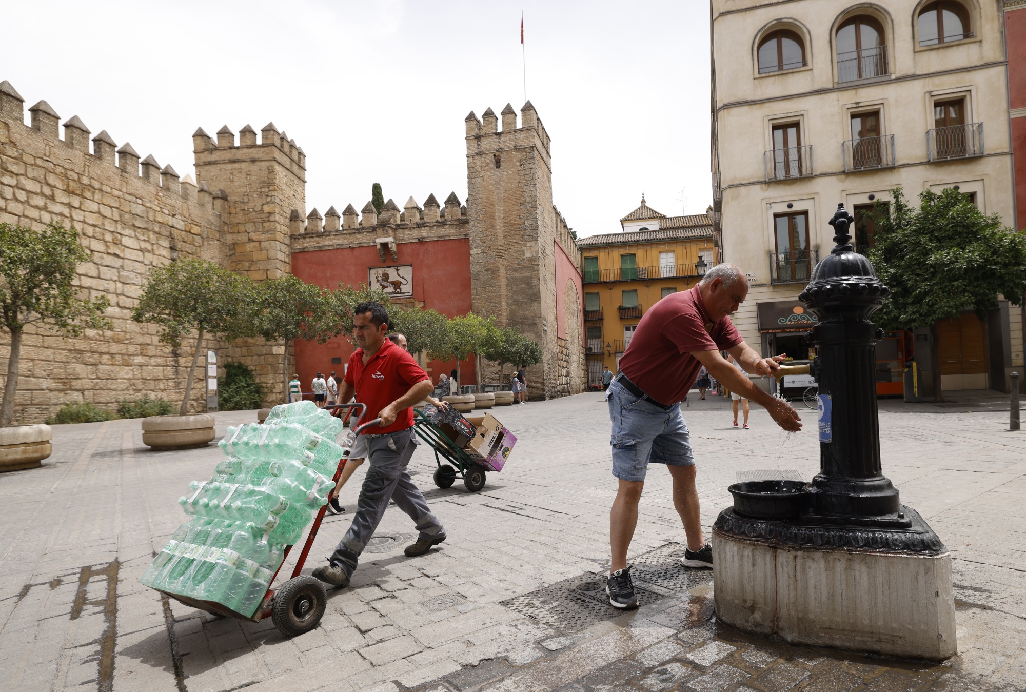 在六月份,塞维利亚的一位行人在炎热的天气中在公共喷泉旁降温。