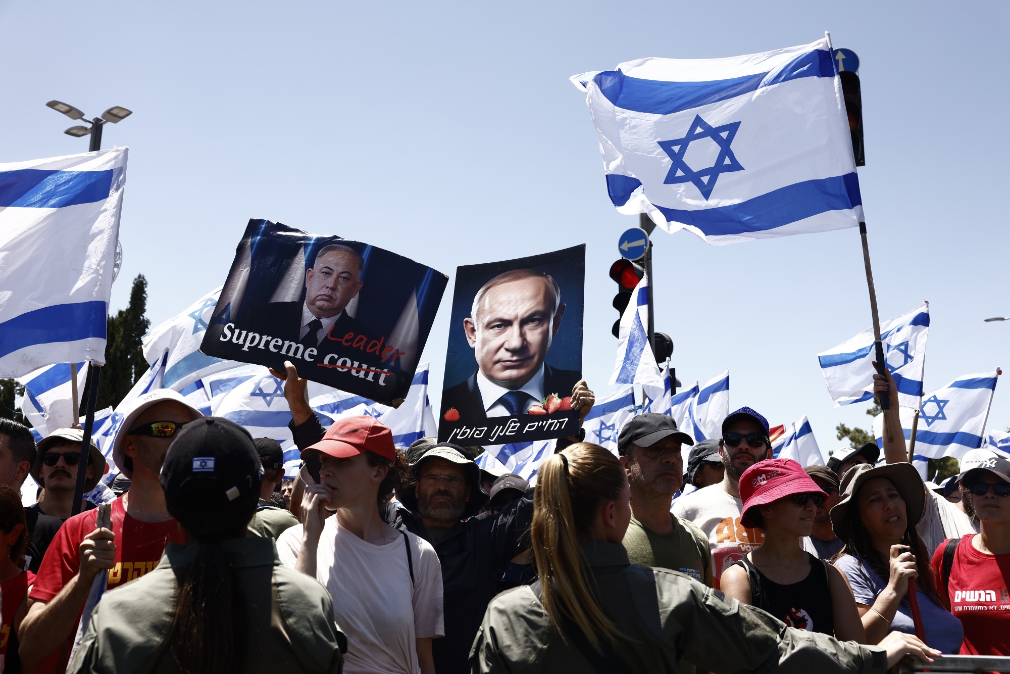 抗议者在7月24日在耶路撒冷以色列议会外抗议司法改革法案。