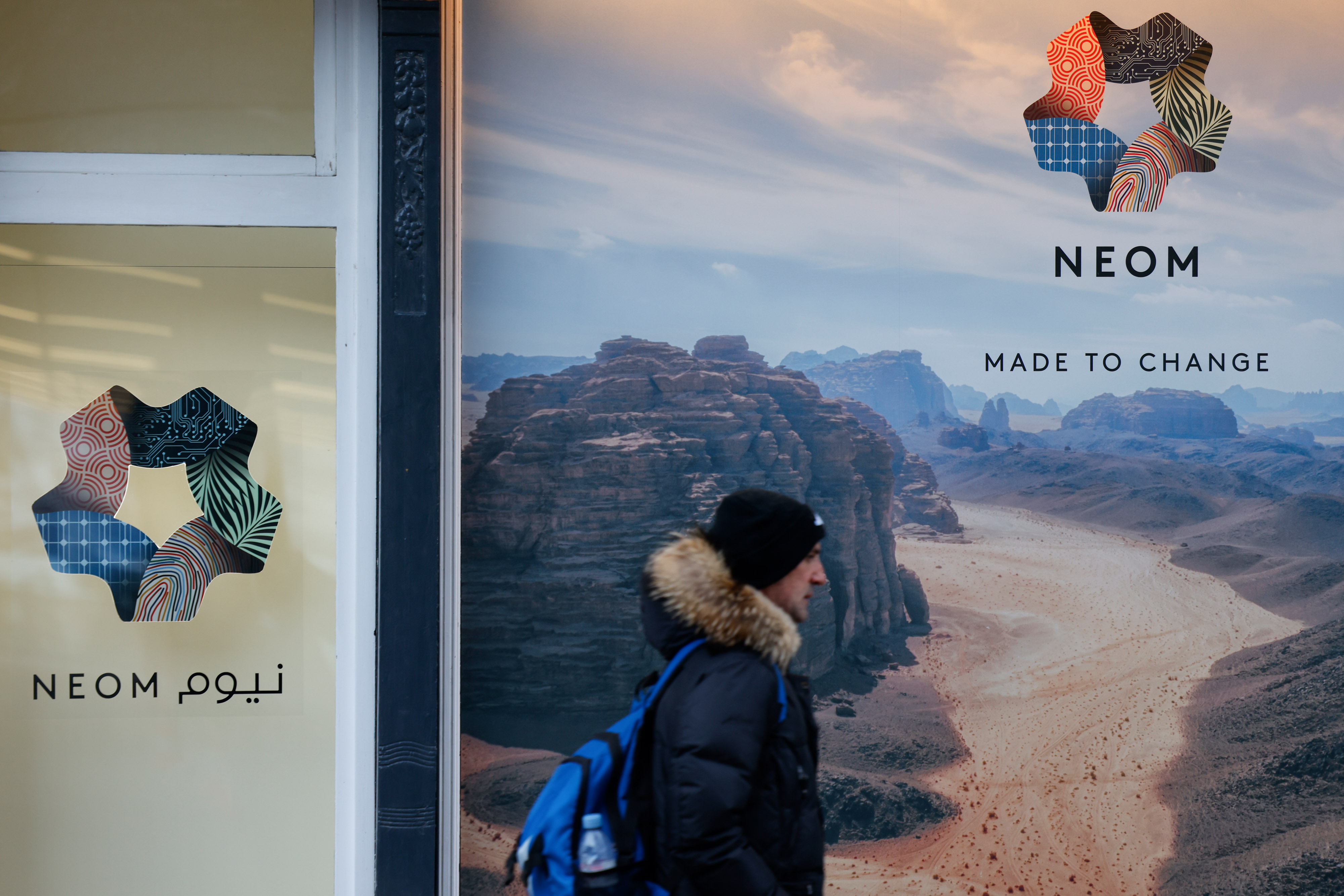 一家位于达沃斯世界经济论坛的NEOM临时店铺窗户上的标志,摄影师:Stefan Wermuth/Bloomberg### 彭博更多内容
