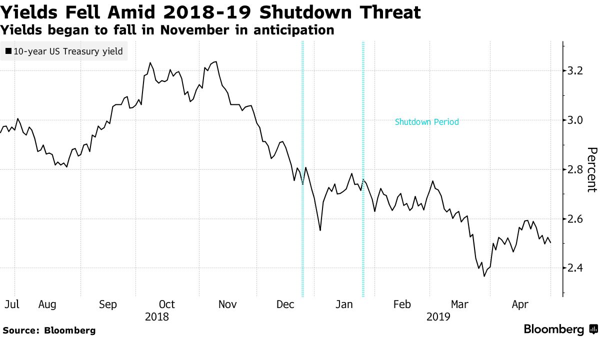 2018年,特朗普总统和国会在边境墙资金问题上陷入僵局,导致了一场持续35天的停摆。再次出现了经济衰退的担忧,引发了债券市场的动荡。尽管停摆始于12月,但在特朗普威胁停摆的11月,收益率就开始下降。
