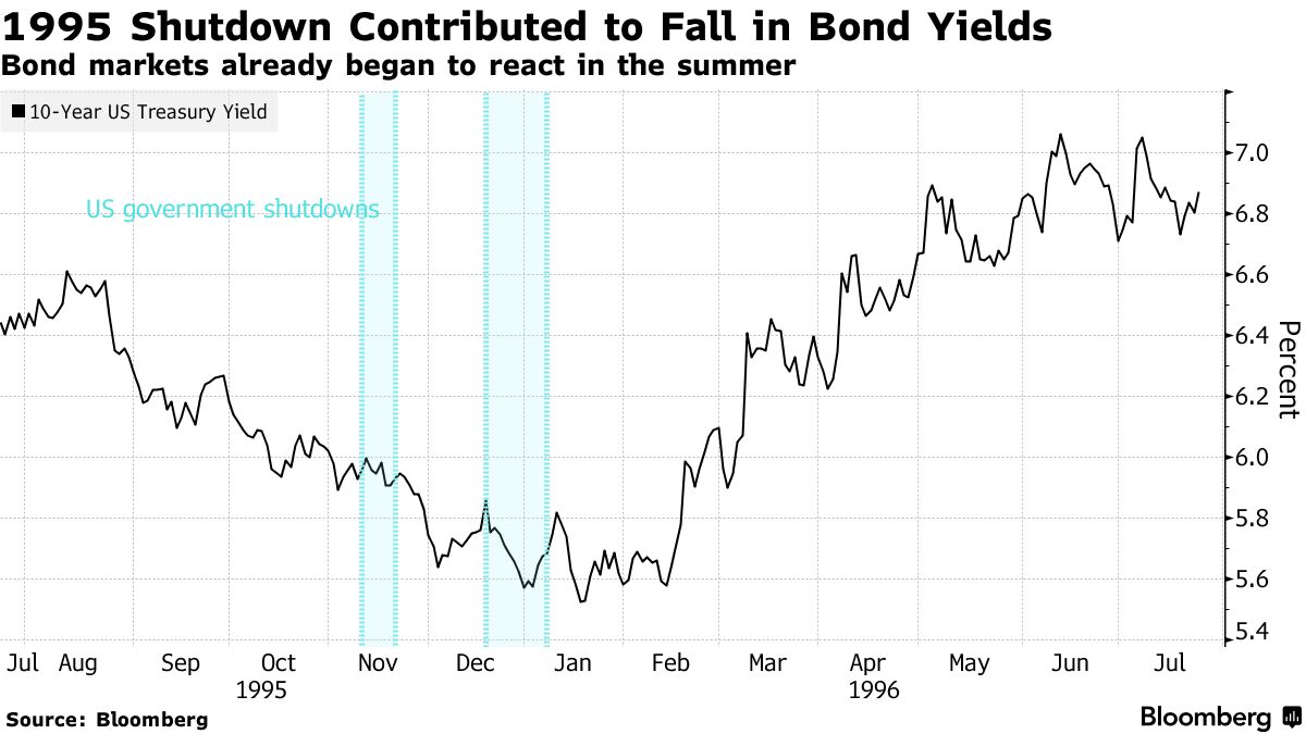 对于那些希望从历史中寻找指引的人来说,有一个好消息。尽管在2018年和1995年左右的以前的停摆引发了市场的涨势,因为预算争论推动了对避险资产的需求。