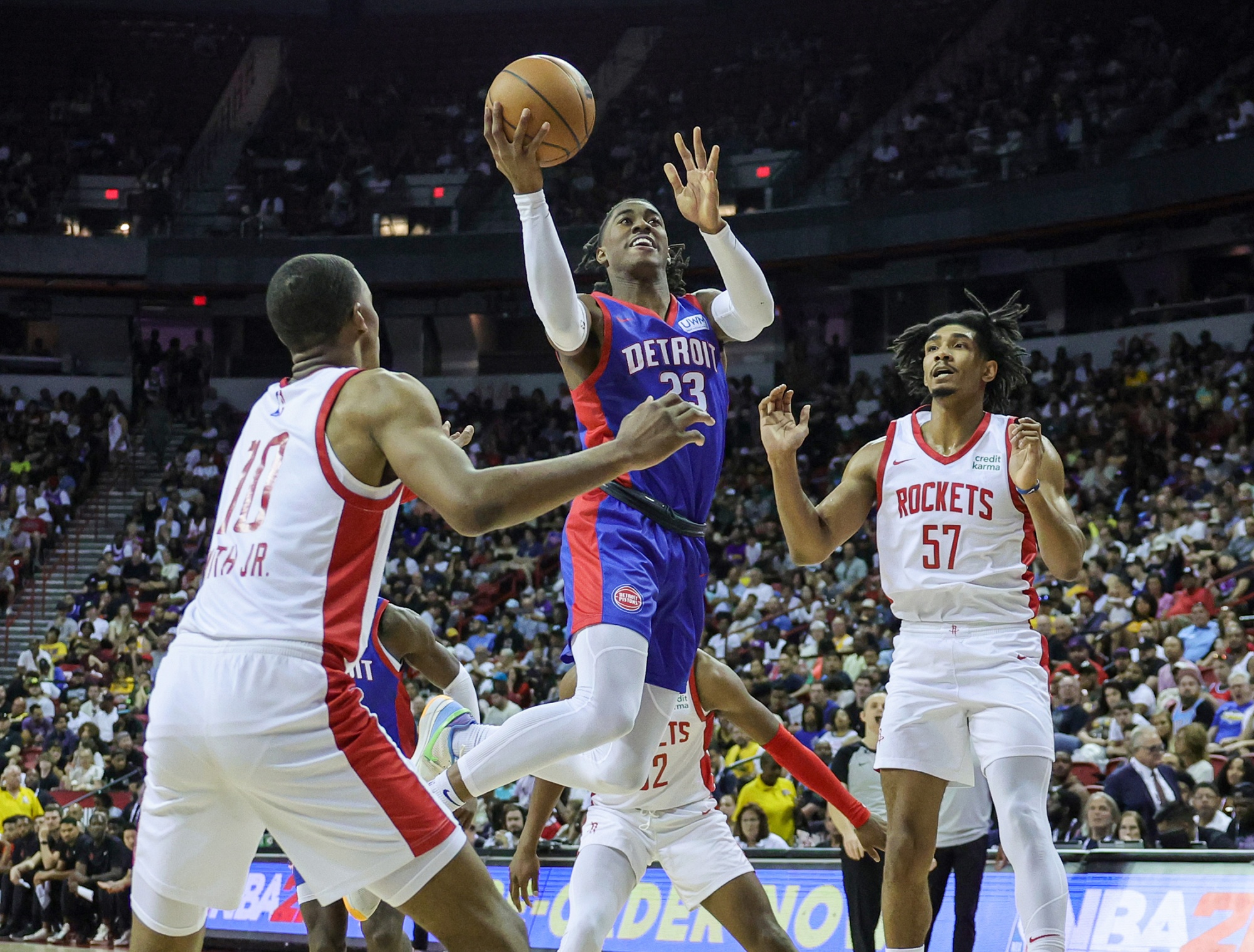 底特律活塞队的贾登·艾维对阵休斯顿火箭队的贾巴里·史密斯和杰梅因·萨缪尔斯在内华达州拉斯维加斯进行了一场NBA夏季联赛比赛,时间是7月9日。