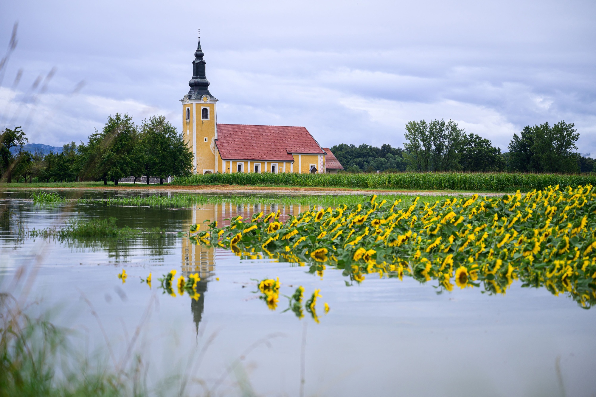 一片被淹没的向日葵田地,位于斯洛文尼亚德拉马村附近的一座教堂旁。