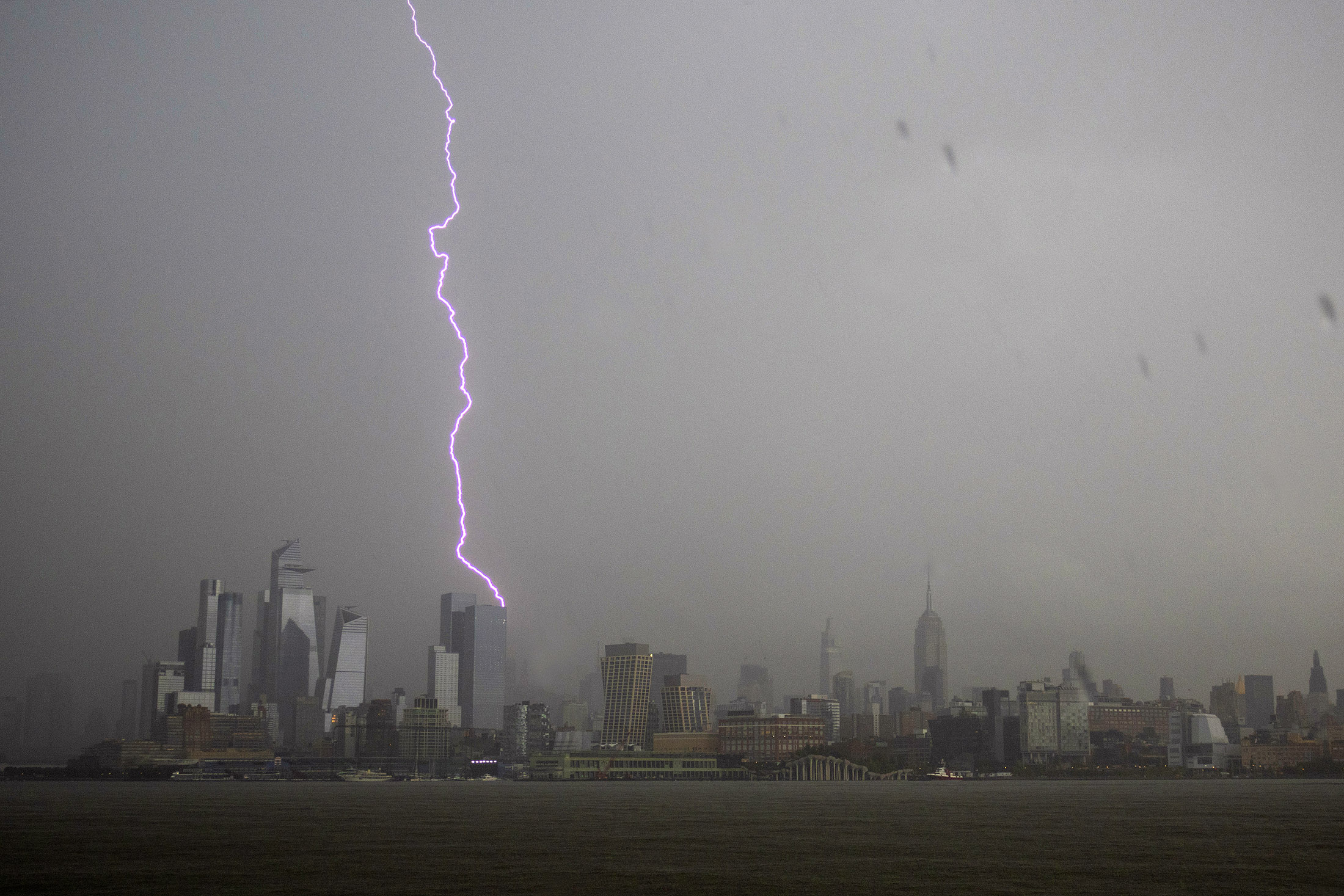 一道闪电击中了曼哈顿西区的Two Manhattan West大楼和曼哈顿中城的天际线,这是2023年7月14日纽约市的一场雷暴。摄影师:Gary Hershorn/Corbis News甚至在它们周一袭击东海岸并导致将近50万人断电之前,今年美国的雷暴已经展示了巨大的破坏力。