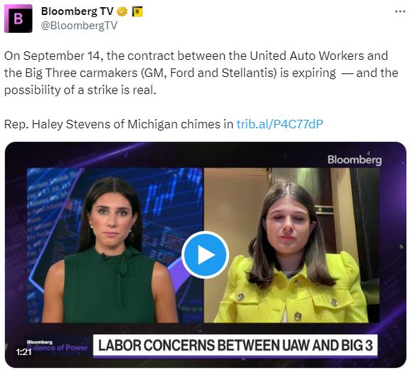 今天在彭博电视台的 权力平衡 节目中,主持人凯利·莱因兹采访了国家防御战略委员会主席简·哈曼,谈论拜登签署行政命令后的美中关系。在昨天的节目中,密歇根州代表海莉·史蒂文斯表示,与三大汽车制造商谈判新合同的美国汽车工人联合会成员“我们不希望看到罢工”。