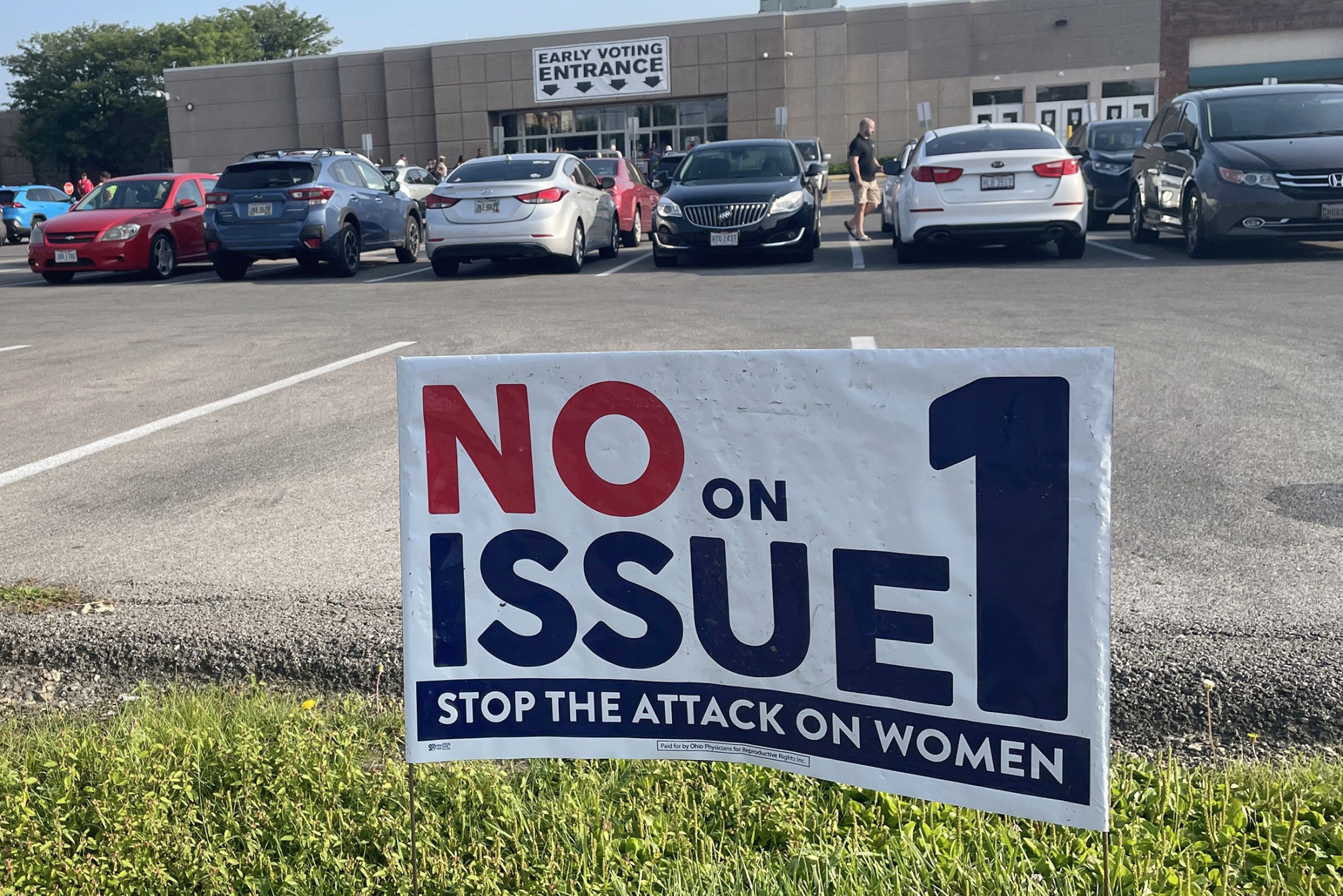 在俄亥俄州哥伦布的富兰克林县选举委员会附近,有一个标志着8月3日俄亥俄州特别选举中呼吁选民在Issue 1上投“否”票的标志。摄影师:Samantha Hendrickson/AP支持堕胎权利的人正在努力让2024年的选民直接投票表决生殖权问题,这是为了在该问题上取得一系列州级胜利后,提高投票率并支持民主党候选人的努力的一部分。