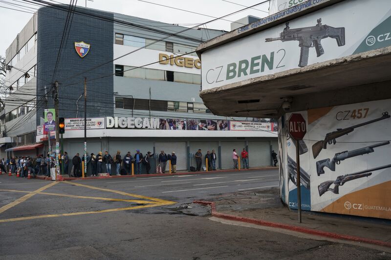 人们在危地马拉城排队等候获取和更新枪支许可证。美国向危地马拉的枪支销售量增长是全球最为陡峭之一。这种涌入使危地马拉超过了人口是其12倍的巴西,成为拉丁美洲美国制半自动枪支的首选目的地。结果显而易见。