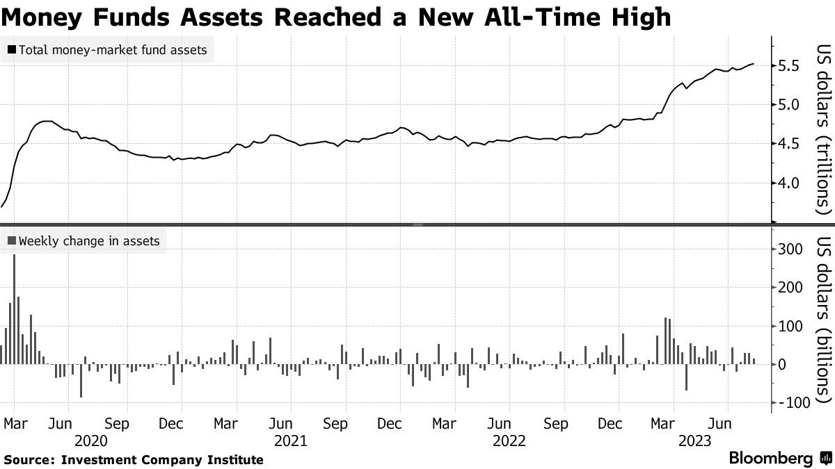 货币市场基金资产攀升至创纪录水平,利率超过5% - 彭博社
