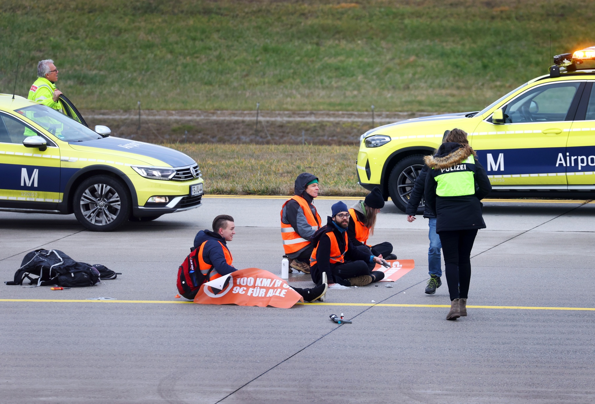 气候活动人士将双手粘在德国慕尼黑机场的跑道上。摄影师:图片联盟/图片联盟### 彭博社更多内容