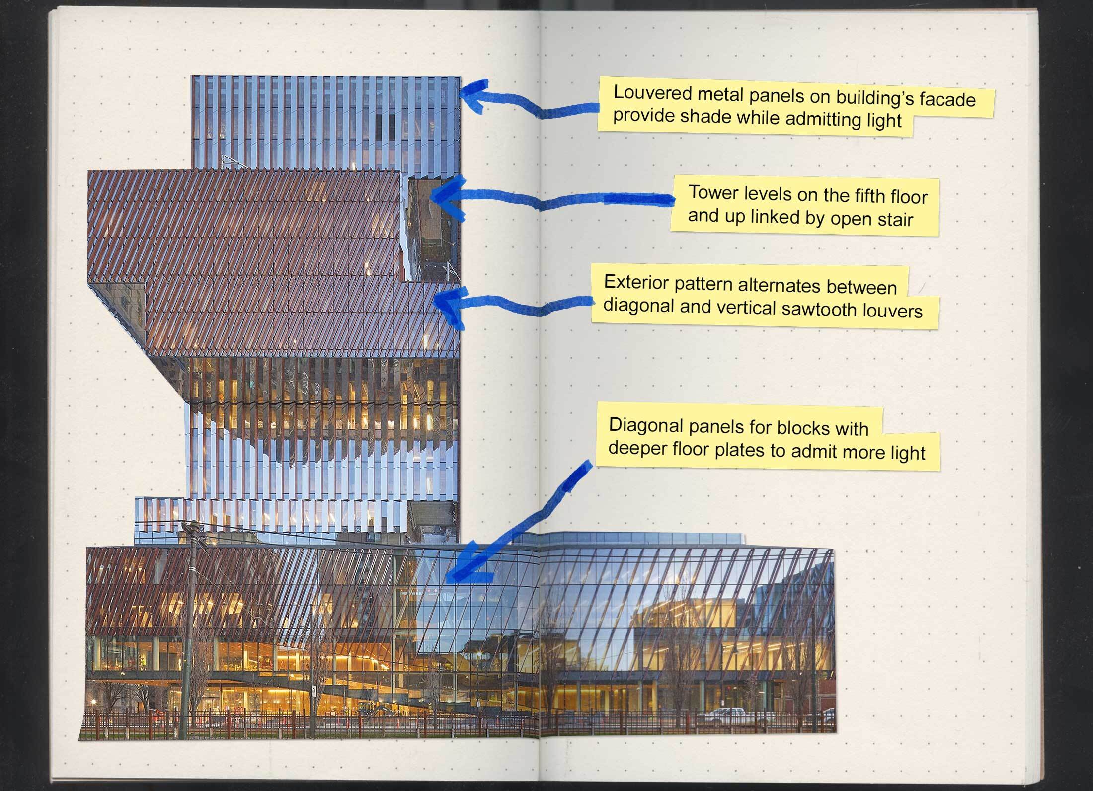 对于学生、教职员工来说,建筑围绕各部门之间的思想流动而组织。一个蜿蜒的丝带楼梯连接建筑物底层的基座部分内的空间,而一个开放式楼梯连接塔楼的上层楼层。对于建筑师来说,想法不是堆积不相连的建筑元素,而是将它们串联在一起。