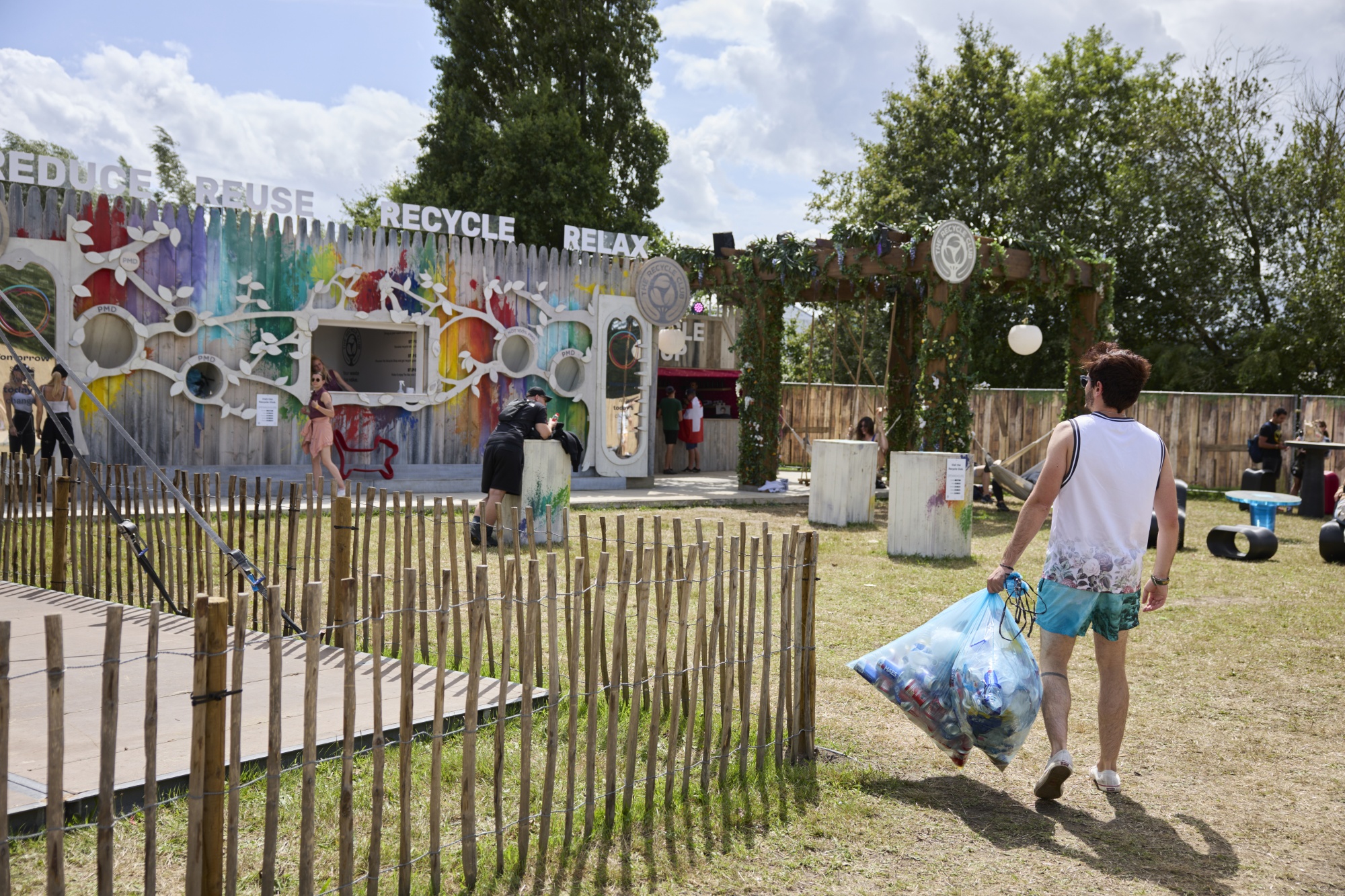 这个节日非常注重回收利用,有紫色垃圾箱让参与者分类食物、塑料和一般垃圾。员工和志愿者还背着垃圾箱收集垃圾,一些食品摊位还尝试使用可食用吸管和杯子。将分类垃圾带到收集区域的露营者有机会赢得包括耳塞、可重复使用的水瓶和由回收纱线制成的袜子在内的奖品。