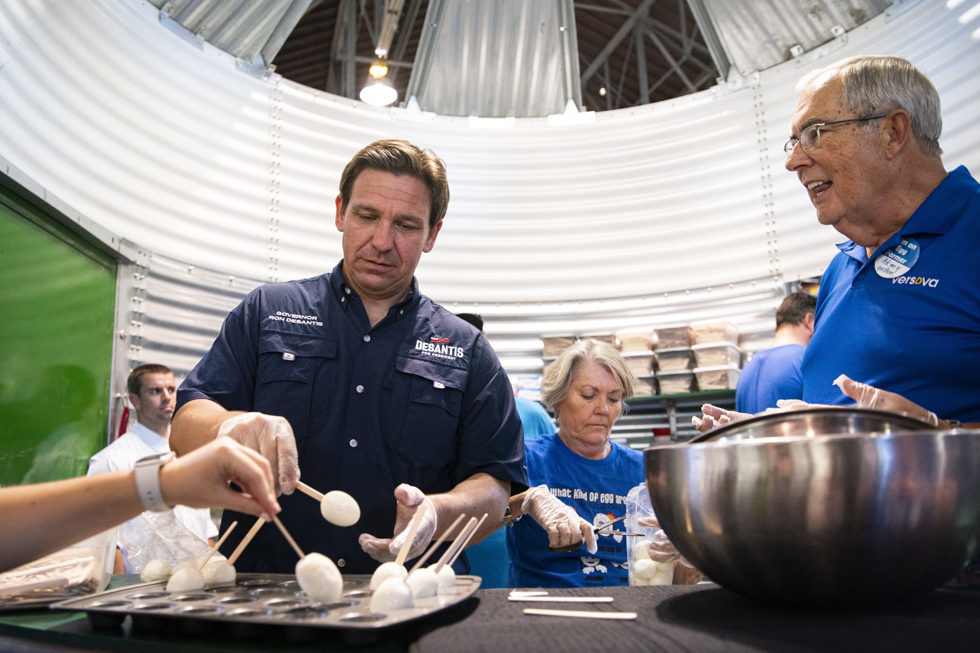 德桑蒂斯在8月12日的爱荷华州立展会上准备了煎蛋串。摄影师:Al Drago/Bloomberg德桑蒂斯得到了著名的脱口秀主持人史蒂夫·迪斯的支持,他对爱荷华州的福音派选民有影响力。但当他与雷诺兹坐下时,一架小飞机在头顶盘旋,拖着一条红色的“像罗恩一样可爱!”横幅。反对者试图用牛铃和哨子淹没他,他还因麦克风故障而被迫中断了一会儿。
