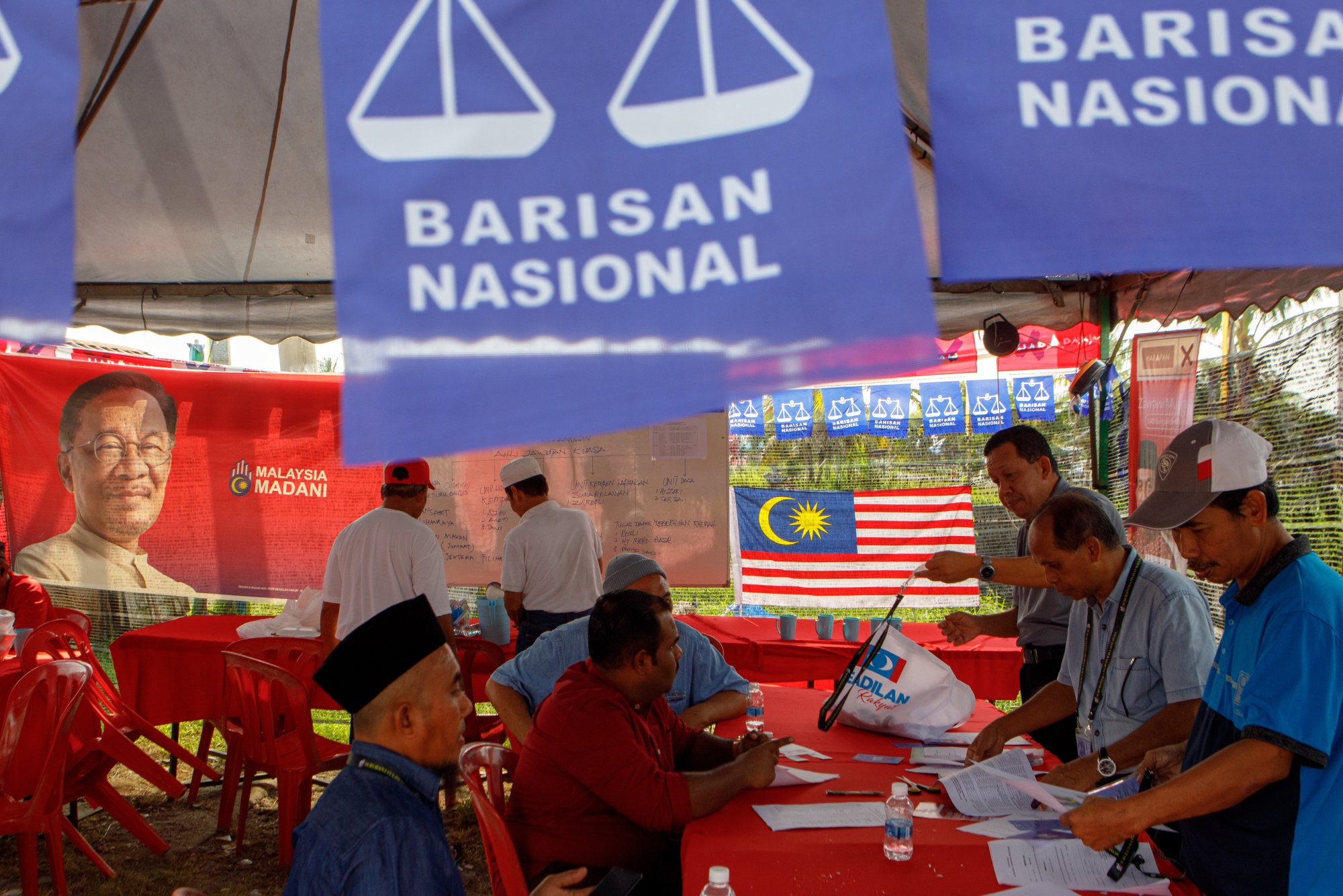 国阵党旗悬挂在8月12日雪兰莪一个投票站附近的希望联盟党营地外。摄影师:Samsul Said/Bloomberg安华成为马来西亚总理的未来取决于赢得地方选举