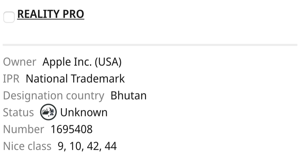 Reality Pro商标在不丹进行了注册。来源:世界知识产权组织(WIPO)接近设备发布时,苹果的营销团队选择了不同的方向。正如我们现在所知,该公司避免了所有与AR、VR和XR有关的提及,而是选择了Vision而非Reality。当头戴式设备最终于6月份亮相时,它被称为Vision Pro,操作系统被称为visionOS。