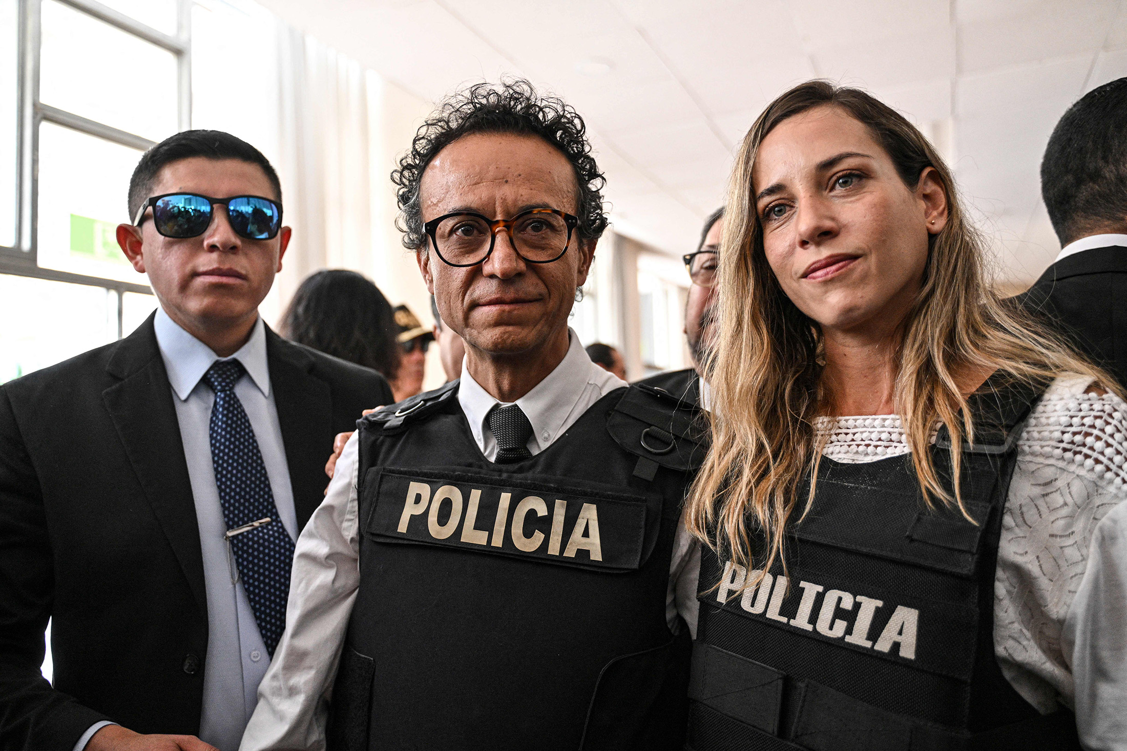 克里斯蒂安·祖里塔(Christian Zurita)(中)和他的竞选搭档安德烈亚·冈萨雷斯(Andrea Gonzalez)在基多于8月13日举行的新闻发布会后。摄影师:马丁·贝尔内蒂(Martin Bernetti)/法新社/盖蒂图片社被暗杀的厄瓜多尔总统候选人费尔南多·维拉维森西奥(Fernando Villavicencio)的政党选择了他的朋友和密友克里斯蒂安·祖里塔(Christian Zurita)作为参加该国动荡选举的候选人。