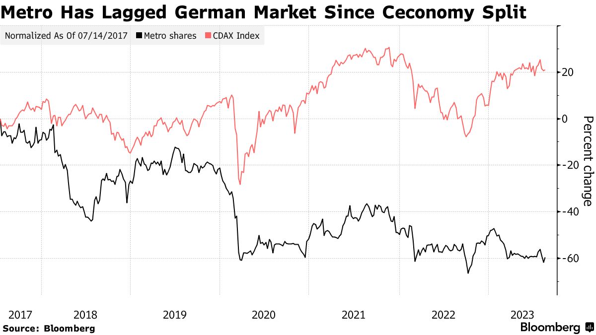 自2017年7月与消费电子集团Ceconomy AG分离以来,Metro的表现一直不佳,股价下跌了58%,而德国CDAX指数上涨了21%。该公司的市值从67亿欧元缩水至27亿欧元。