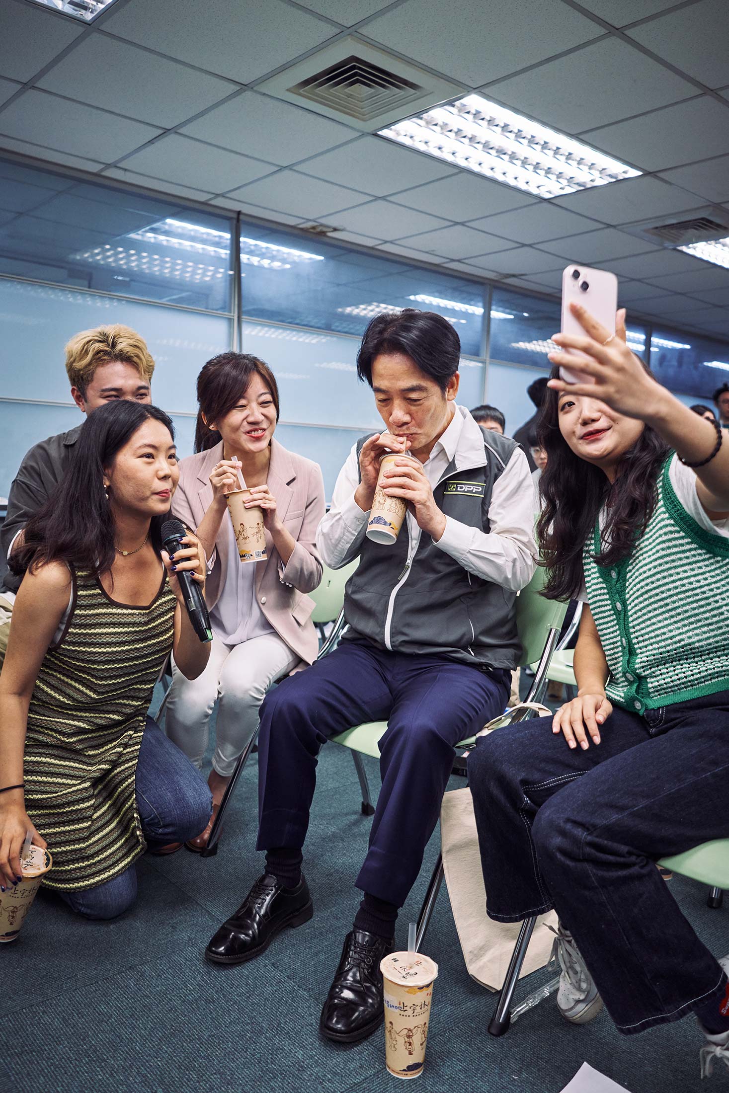 赖在民进党总部与学生志愿者一起喝珍珠奶茶。摄影师:An Rong Xu为彭博商业周刊拍摄赖对这个现实毫不畏惧。推广台湾身份是民进党近四十年存在的基础,这一切最终导致了蔡英文的现任总统任期。 (由于任期限制,她无法寻求连任。)她的政府最近将男性的强制兵役服务延长到一年,从四个月延长;赖为这一具有争议的举措辩护,认为这是必要的,以向台湾的朋友,主要是美国,表明该岛屿已经准备好并愿意自卫。