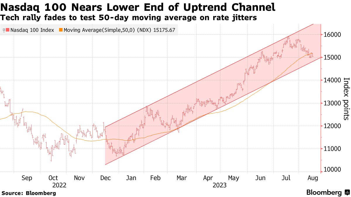 随着科技股在八月份的涨势减缓,纳斯达克100指数正逐渐接近今年上升通道的低端。这一基准指数在七月份连续上涨了五个月,目前正迎来本年度最糟糕的一个月。该指数下跌约4.8%,正在测试其50日移动平均线。