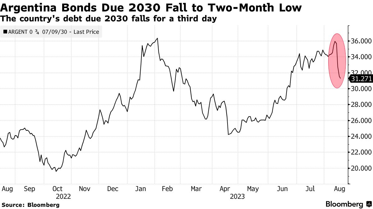 在少数投资者认为不会成为严肃竞争者的外来者米莱在初选中脱颖而出后,阿根廷资产出售。初选被视为对总统选举的晴雨表,在一个民调极不可靠的国家,这种情况迫使政府在周一市场开盘时将其严格控制的官方汇率贬值了18%。