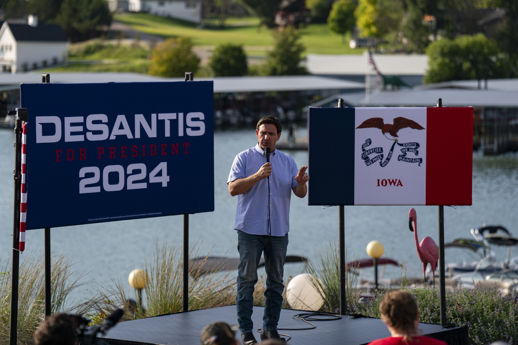 罗恩·德桑提斯在美国爱荷华州帕诺拉的一次竞选活动中讲话,时间是8月11日。