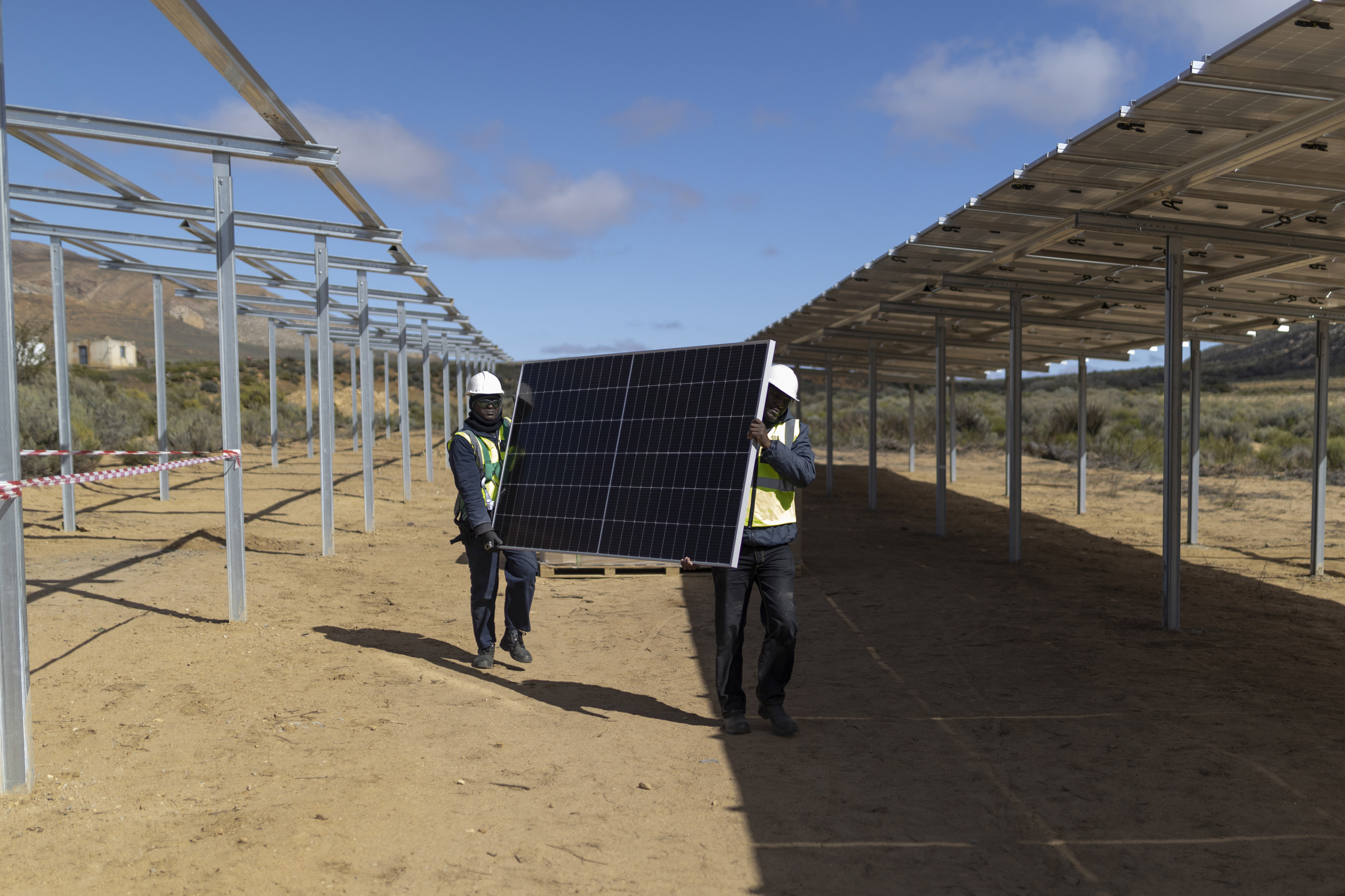 工人们在南非Groenfontein的农场安装太阳能电池板。