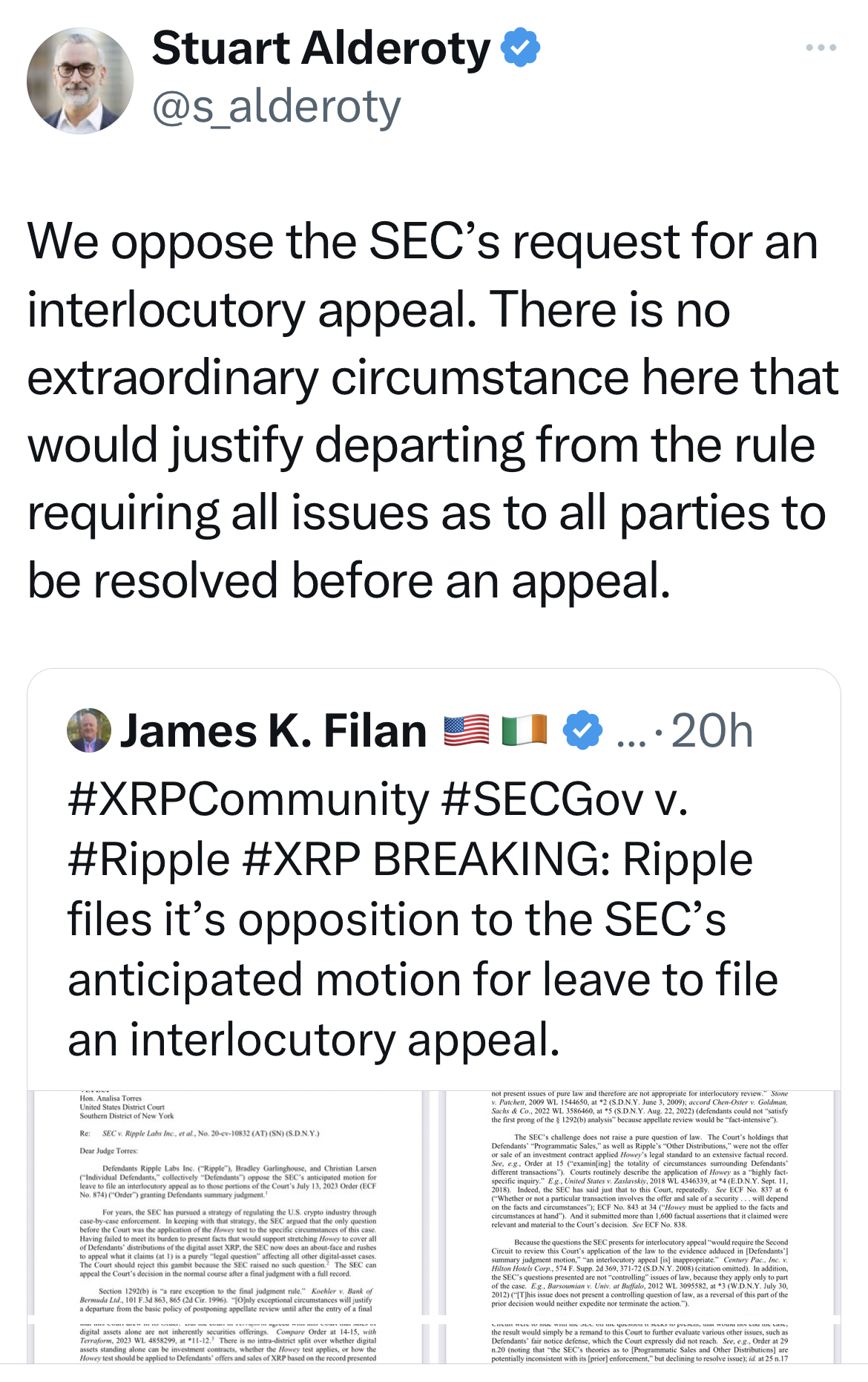 来源: @s_alderoty](https://twitter.com/s_alderoty/status/1691917112019960288) 周四,Torres 允许SEC继续进行提出临时上诉的动议。但无论过程如何,要解决Ripple案件核心问题还需要很多个月甚至几年的时间。